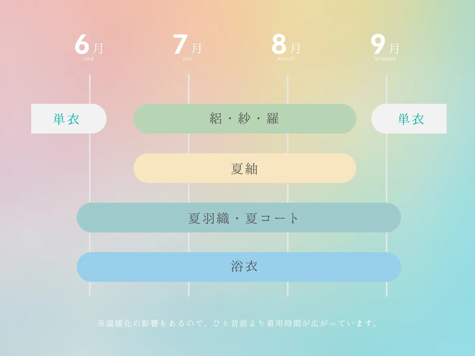 かつては夏物(薄物)は7〜8月の盛夏に着るのが一般的でしたが、近年は温暖化の影響もあり、6月頃から取り入れる方が増えており、